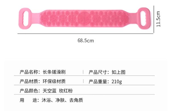 這款通用硅膠洗澡刷采用拉條式設計,單人即可輕松搓掉背部泥垢,刷子兩面都可以用,搓泥效果強力。采用硅膠材質生產,使用時不會刮傷皮膚,不會引起任何不適,老人、小孩都可以用。