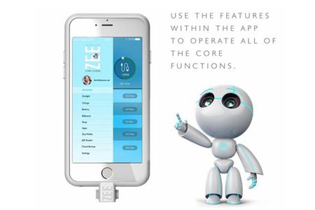 這款智能手機套是 Hello Zee 的新產品——即“智能通用 Zee Smart Core(智能核心)”,能夠為 iPhone、安卓手機或者平板提供128G 內存,并且是一塊充電電池,還附帶 LED 燈和保護外殼。